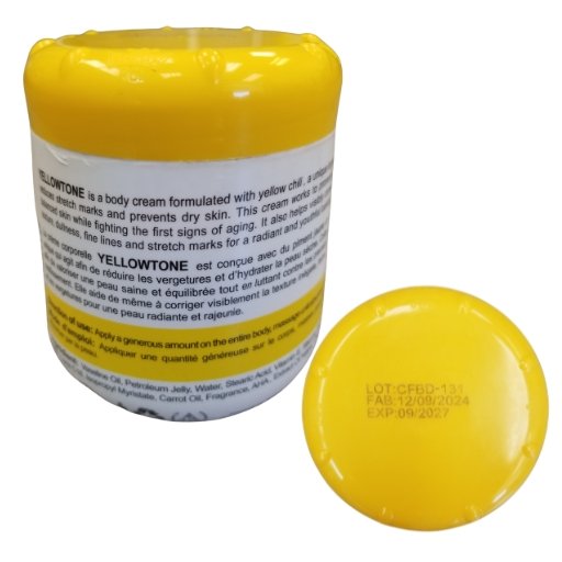 YellowTone body cream formulated with yellow chili, a unique ingredient that reduces stretch marks and prevents dry skin. This cream works to promote a healthy balanced skin while fighting the first signs of aging. It also helps visibly correct uneven texture, dullness, fine lines and stretch marks for a radiant and youthful looking skin.